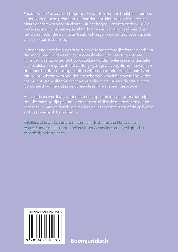 Personen- en familierecht begrepen biedt de lezer een bruikbaar kompas in het Nederlandse personen- en familierecht. Het boek is in de eerste plaats geschreven voor studenten uit het hoger (juridisch) onderwijs. Ook professionals uit de beroepspraktijk kunnen er hun voordeel mee doen, net als eenieder die een beter beeld wil krijgen van de juridische aspecten van zijn eigen levensloop.