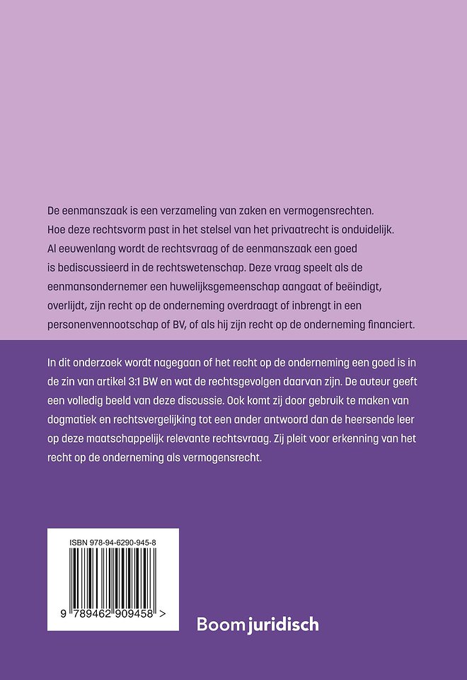 In dit onderzoek wordt nagegaan of het recht op de onderneming een goed is in de zin van artikel 3:1 BW en wat de rechtsgevolgen daarvan zijn. De auteur geeft een volledig beeld van deze discussie. Ook komt zij door gebruik te maken van dogmatiek en rechtsvergelijking tot een ander antwoord dan de heersende leer op deze maatschappelijk relevante rechtsvraag. Zij pleit voor erkenning van het recht op de onderneming als vermogensrecht.