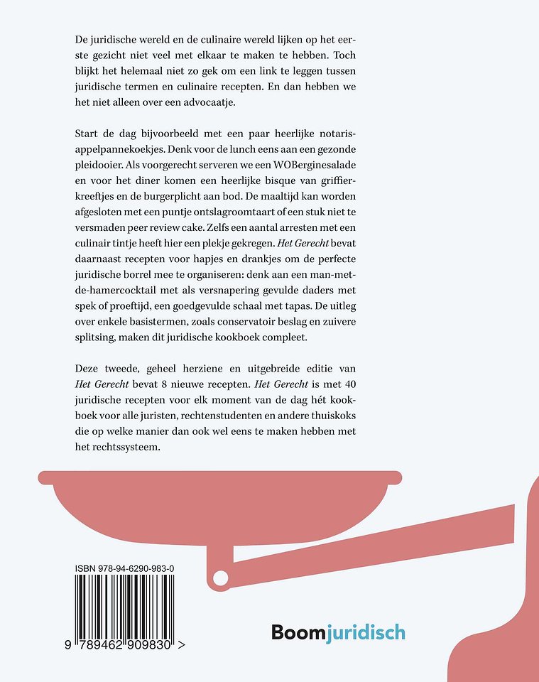 Het Gerecht bevat daarnaast recepten voor hapjes en drankjes om de perfecte juridische borrel mee te organiseren: denk aan een man-met-de-hamer-cocktail met als versnapering gevulde daders met spek of proeftijd, een goedgevulde schaal met tapas. De uitleg over enkele basistermen, zoals conservatoir beslag en zuivere splitsing, maken dit juridische kookboek compleet.