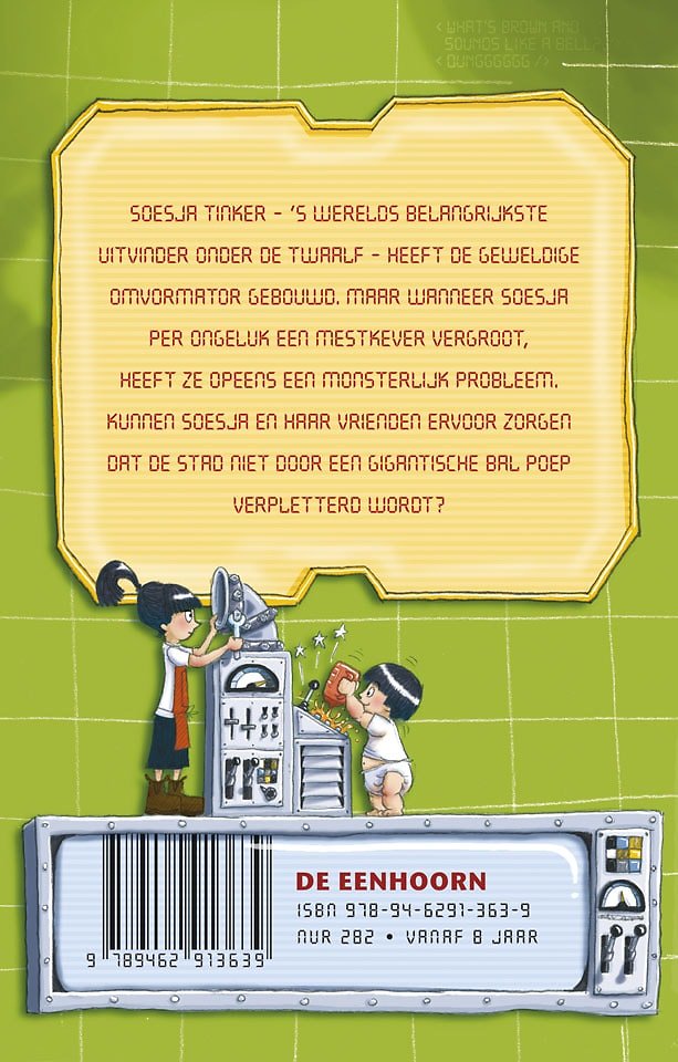 Soesja Tinker, ’s werelds eerste uitvinder onder twaalf jaar, heeft een geweldige vergroot-machine gebouwd. Maar dan vergroot Soesja per ongeluk een mestkever tot gigantische proporties. En heeft ze plots een monsterlijk groot probleem … Kunnen Soesja en haar vrienden ervoor zorgen dat de stad niet verpletterd wordt onder een gigantische hoop stront?