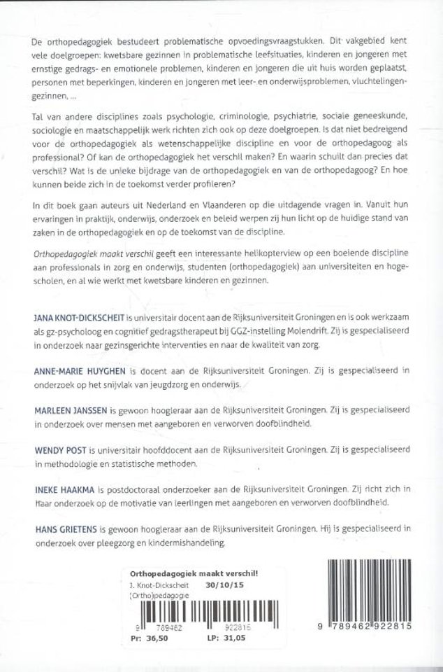 Orthopedagogiek maakt verschil geeft een interessant helikopterview op een boeiende discipline aan professionals in zorg en onderwijs, studenten (orthopedagogiek) aan universiteiten en hogescholen, en al wie werkt met kwetsbare kinderen en gezinnen.