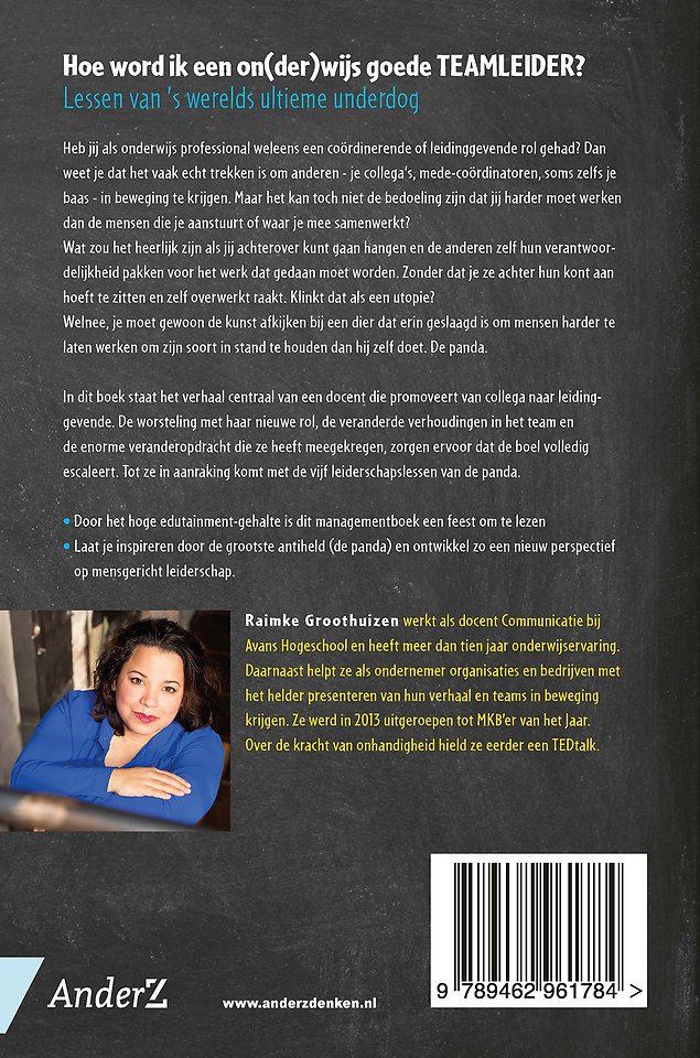In dit boek staat het verhaal centraal van een docent die promoveert van collega naar leidinggevende. De worsteling met haar nieuwe rol, de veranderde verhoudingen in het team en de enorme veranderopdracht die ze heeft meegekregen, zorgen ervoor dat de boel volledig escaleert. Tot ze in aanraking komt met de vijf leiderschapslessen van de panda.