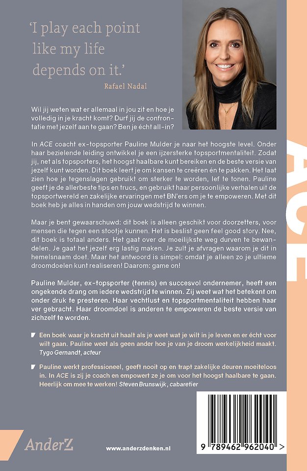 In ACE coacht ex-topsporter Pauline Mulder je naar het hoogste level. Onder haar bezielende leiding ontwikkel je een ijzersterke topsportmentaliteit. Zodat jij, net als topsporters, het hoogst haalbare kunt bereiken en de beste versie van jezelf kunt worden. Dit boek leert je om kansen te creëren én te pakken. Het laat zien hoe je tegenslagen gebruikt om sterker te worden, lef te tonen. Pauline geeft je de allerbeste tips en trucs en gebruikt haar persoonlijke verhalen uit de topsport- en zakenwereld om je te empoweren.