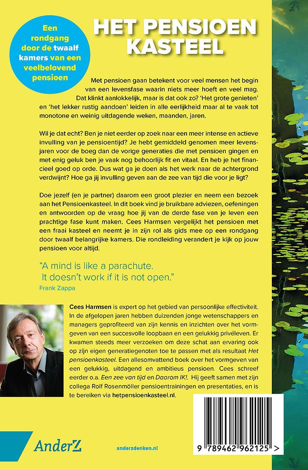 Doe jezelf (en je partner) daarom een groot plezier en neem een bezoek aan het Pensioenkasteel. In dit boek vind je bruikbare adviezen, oefeningen en antwoorden op de vraag hoe jij van de derde fase van je leven een prachtige fase kunt maken. Cees Harmsen vergelijkt het pensioen meteen fraai kasteel en neemt je in zijn rol als gids mee op een rondgang door twaalf belangrijke kamers. Die rondleiding verandert je kijk op jouw pensioen voor altijd.