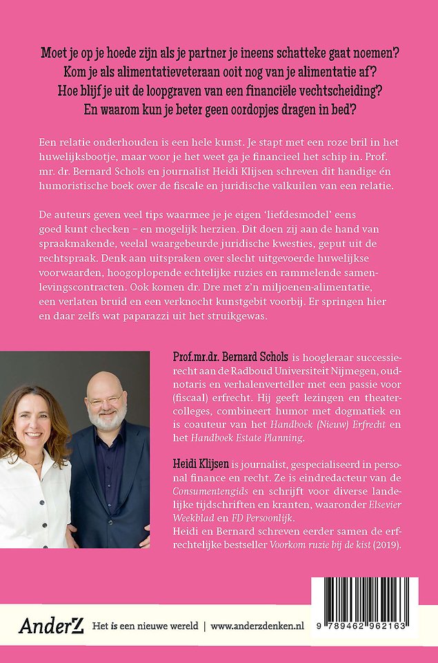 Een relatie onderhouden is een hele kunst. Je stapt met een roze bril in het huwelijksbootje, maar voor je het weet ga je financieel het schip in. Prof. mr. dr. Bernard Schols en journalist Heidi Klijsen schreven dit handige én humoristische boek over de fiscale en juridische valkuilen van een relatie.