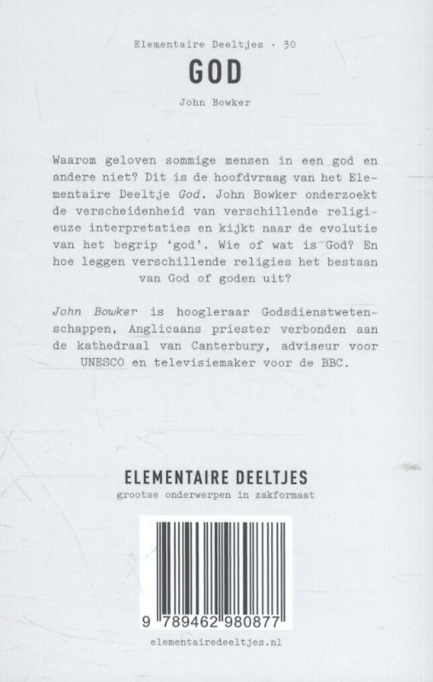 Waarom geloven sommige mensen in een god en andere niet? Dit is de hoofdvraag van het 'Elementaire Deeltje' God. John Bowker onderzoekt de verscheidenheid van verschillende religieuze interpretaties en kijkt naar de evolutie van het begrip 'god'. Wie of wat is God? En hoe leggen verschillende religies het bestaan van God of goden uit?