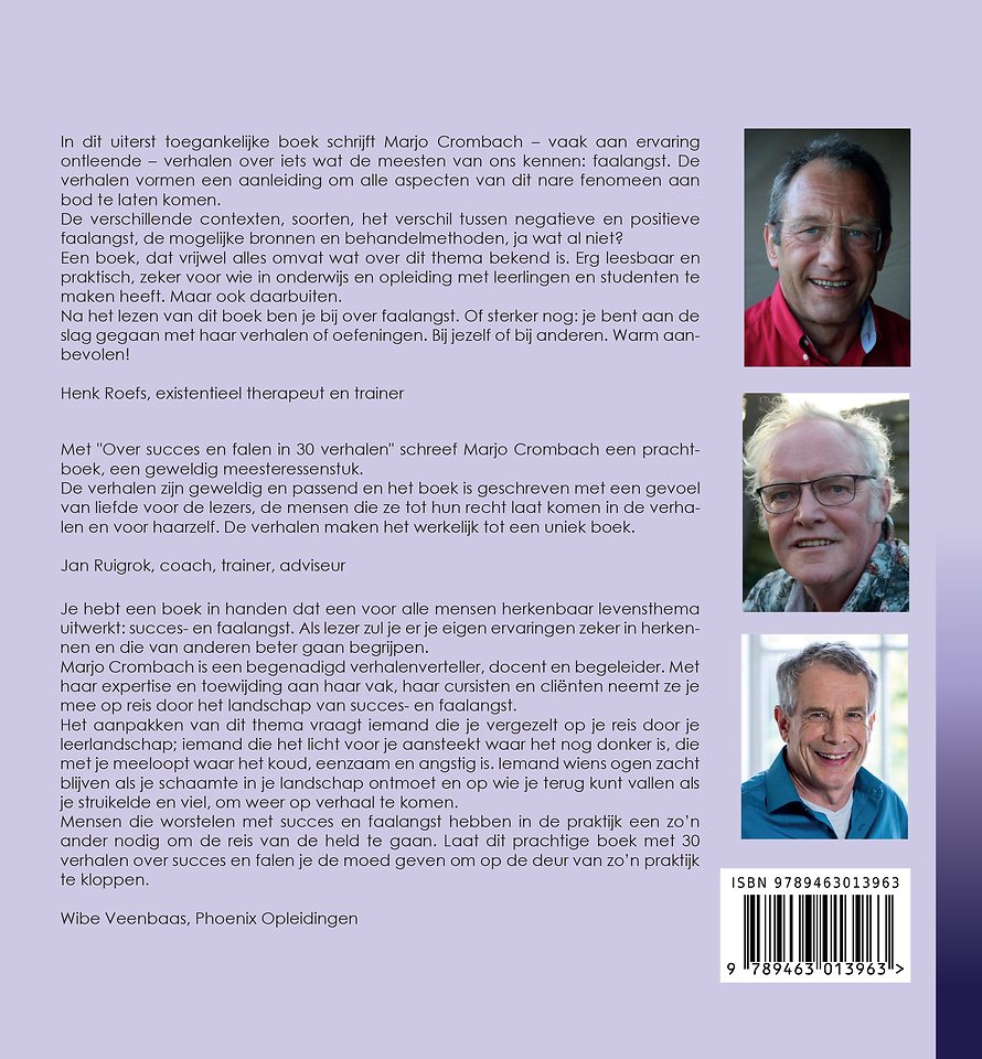 Je hebt een boek in handen dat een voor alle mensen herkenbaar levensthema uitwerkt: succes- en faalangst. Als lezer zul je er je eigen ervaringen zeker in herkennen en die van anderen beter gaan begrijpen. Marjo Crombach is een begenadigd verhalenverteller, docent en begeleider. Met haar expertise en toewijding aan haar vak, haar cursisten en cliënten neemt ze je mee op reis door het landschap van succes- en faalangst. Het aanpakken van dit thema vraagt iemand die je vergezelt op je reis door je leerlandschap; iemand die het licht voor je aansteekt waar het nog donker is, die met je meeloopt waar het koud, eenzaam en angstig is. Iemand wiens ogen zacht blijven als je schaamte in je landschap ontmoet en op wie je terug kunt vallen als je struikelde en viel, om weer op verhaal te komen. Mensen die worstelen met succes en faalangst hebben in de praktijk een zo’n ander nodig om de reis van de held te gaan. Laat dit prachtige boek met 30 verhalen over succes en falen je de moed geven om op de deur van zo’n praktijk te kloppen.