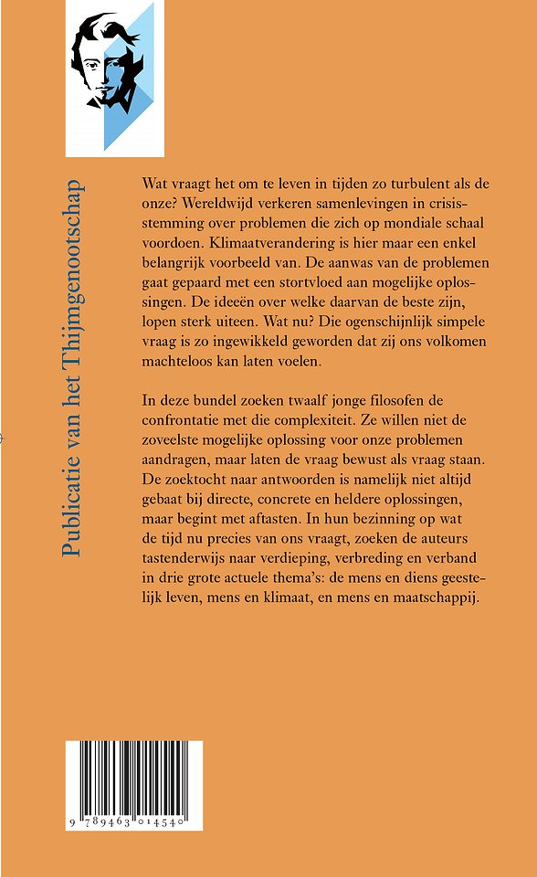 In deze bundel zoeken twaalf jonge filosofen de confrontatie met die complexiteit. Ze willen niet de zoveelste mogelijke oplossing voor onze problemen aandragen, maar laten de vraag bewust als vraag staan. De zoektocht naar antwoorden is namelijk niet altijd gebaat bij directe, concrete en heldere oplossingen, maar begint met aftasten. In hun bezinning op wat de tijd nu precies van ons vraagt, zoeken de auteurs tastenderwijs naar verdieping, verbreding en verband in drie grote actuele thema’s: de mens en diens geestelijk leven, mens en klimaat, en mens en maatschappij.