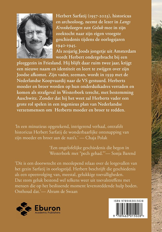 Herbert Sarfatij (1937-2023), historicus en archeoloog, neemt de lezer in Langs Kronkelwegen van Geluk mee in zijn zoektocht naar zijn eigen vroegste geschiedenis tijdens de oorlogsjaren 1940-1945. Als zesjarig Joods jongetje uit Amsterdam wordt Herbert ondergebracht bij een pleeggezin in Friesland. Hij blijft daar ruim twee jaar, krijgt een nieuwe naam en identiteit en leert te zwijgen over zijn Joodse afkomst. Zijn vader, zeeman, wordt in 1939 met de Nederlandse Koopvaardij naar de VS gestuurd. Herberts moeder en broer worden op hun onderduikadres verraden en komen als strafgeval in Westerbork terecht, met bestemming Auschwitz. Zonder dat hij het weet zal Herberts vader een grote rol spelen in een ingenieus plan van Nederlandse verzetsmensen om Herberts moeder en broer te redden.