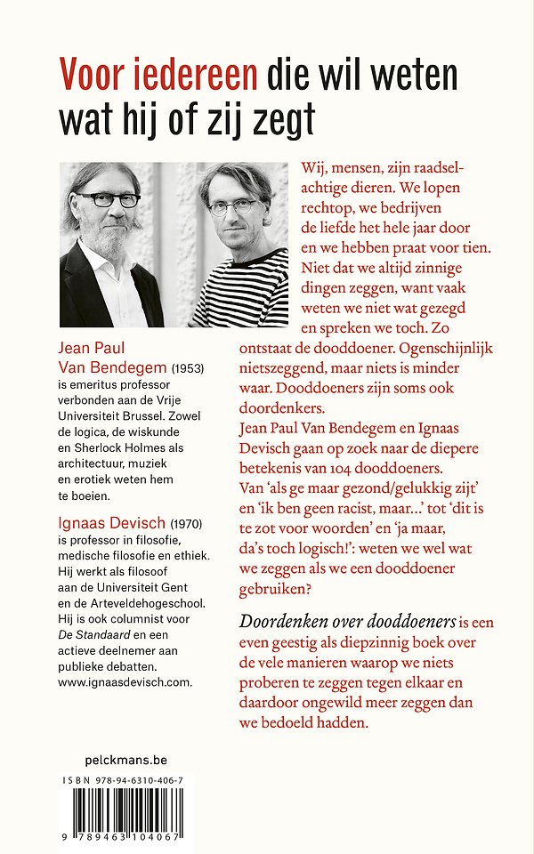 Wij, mensen, zijn raadselachtige dieren. We lopen rechtop, we bedrijven de liefde het hele jaar door en we hebben praat voor tien. Niet dat we altijd zinnige dingen zeggen, want vaak weten we niet wat gezegd en spreken we toch. Dooddoeners heet zoiets. Ogenschijnlijk zijn ze nietszeggend, maar niets is minder waar. Dooddoeners zijn soms ook doordenkers. Jean Paul Van Bendegem en Ignaas Devisch gaan op zoek naar de diepere betekenis van 104 dooddoeners. Van ‘als we maar gezond zijn’ en ‘ik ben geen racist, maar’ tot ‘dit is te zot voor woorden’ en ‘ja maar, da’s toch logisch’: weten we wel wat we zeggen als we een dooddoener gebruiken?