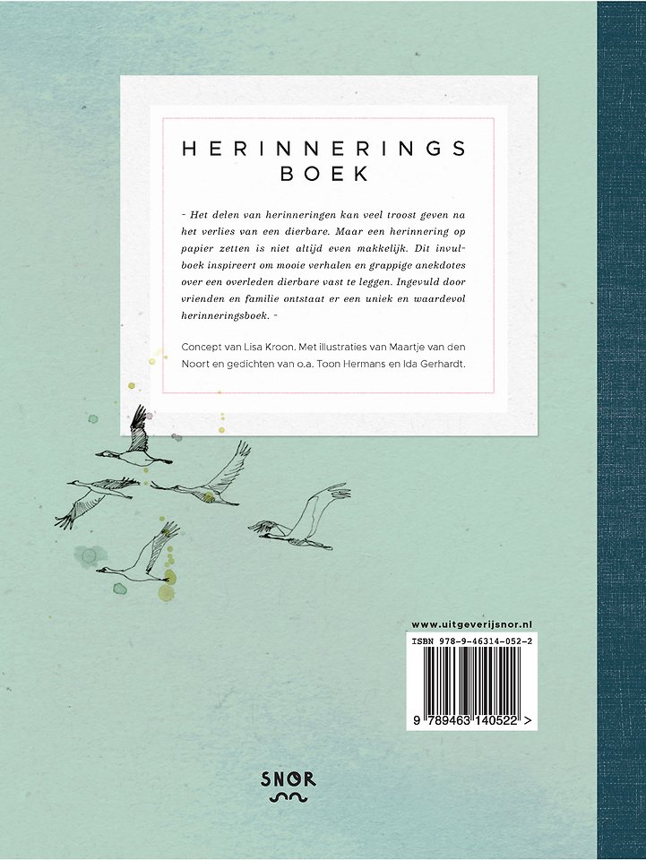 Het delen van herinneringen kan veel troost geven na het verlies van een dierbare. Maar een herinnering op papier zetten is niet altijd even makkelijk. Dit invulboek inspireert om mooie verhalen en grappige anekdotes over een overleden dierbare vast te leggen. Ingevuld door vrienden en familie ontstaat er een uniek en waardevol herinneringsboek. Concept van Lisa Kroon. Met illustraties van Maartje van den Noort en gedichten van o.a. Toon Hermans en Ida Gerhardt.