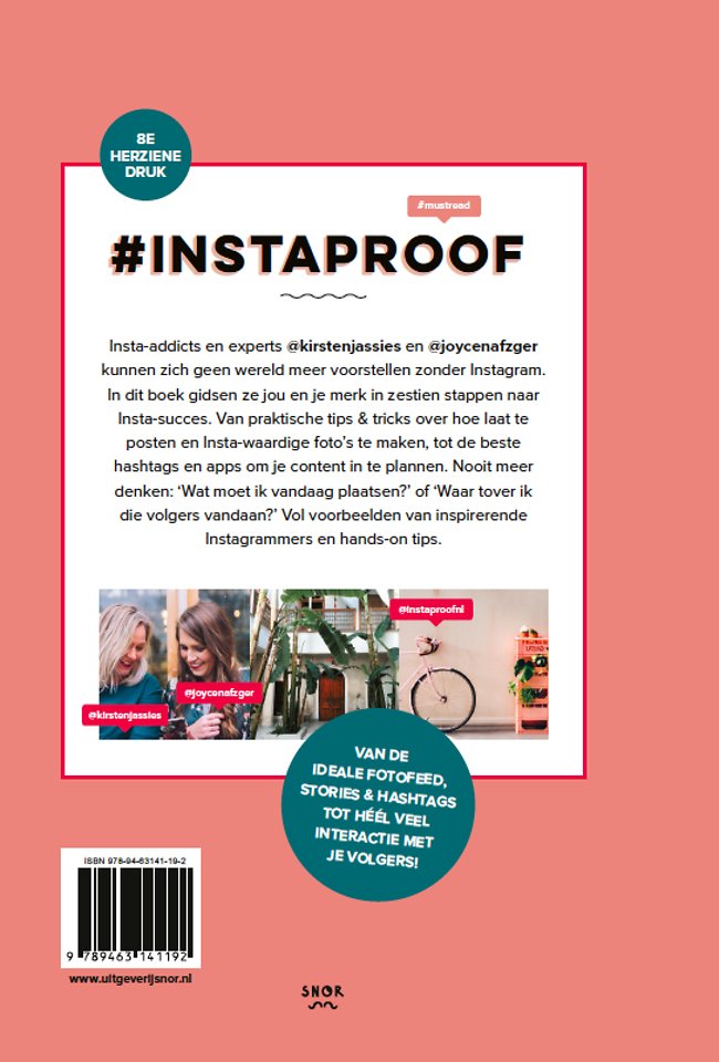 In het boek Instaproof vind je de beste tips en voorbeelden om je instagramaccount helemaal da bomb te maken. Hoe vind je volgers, hoe hou je ze betrokken en hoe zorg je voor interessante content? Hoe maak je een contentkalender en waarom de selfies eigenlijk? Deze versie van Instaproof is helemaal vernieuwd!