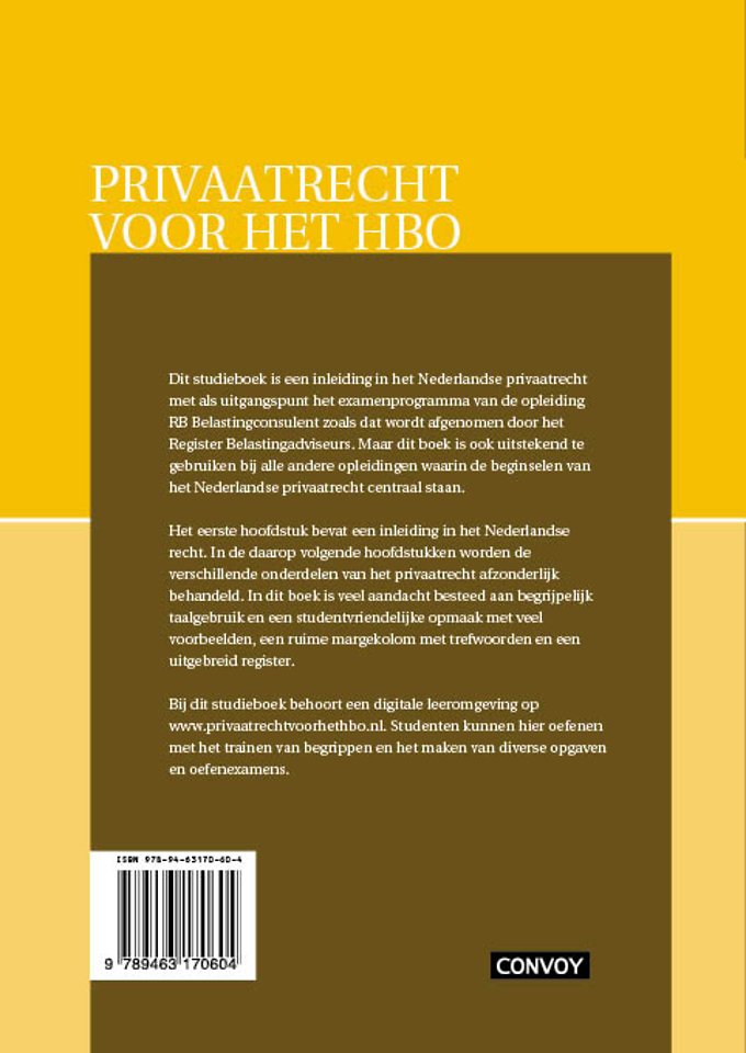 Dit studieboek is een inleiding in het Nederlandse privaatrecht met als uitgangspunt het examenprogramma van de opleiding RB Belastingconsulent zoals dat wordt afgenomen door het Register Belastingadviseurs. Maar dit boek is ook uitstekend te gebruiken bij alle andere opleidingen waarin de beginselen van het Nederlandse privaatrecht centraal staan.