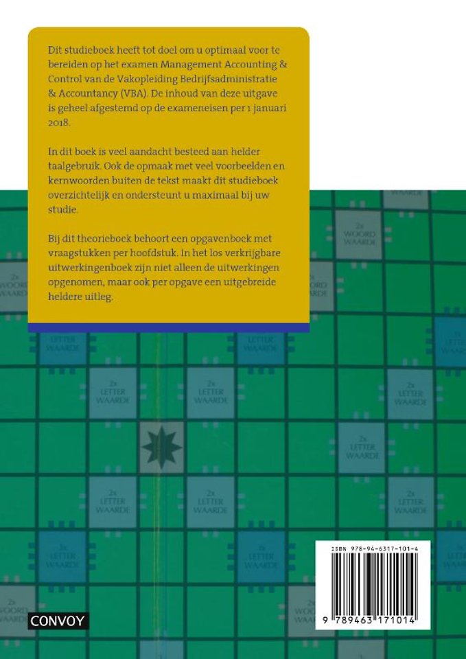 Dit studieboek heeft tot doel om u optimaal voor te bereiden op het examen Management Accounting & Control van de Vakopleiding Bedrijfsadministratie & Accountancy (VBA).