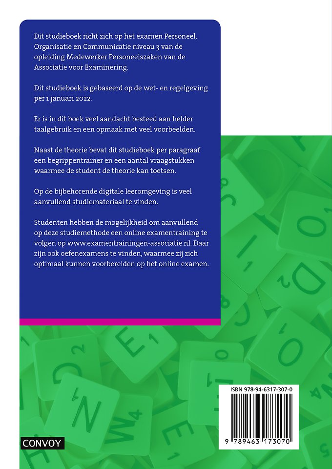 Dit studieboek richt zich op het examen Personeel, Organisatie en Communicatie niveau 3 van de opleiding Medewerker Personeelszaken van de Associatie voor Examinering. Dit studieboek is gebaseerd op de wet- en regelgeving per 1 januari 2022.