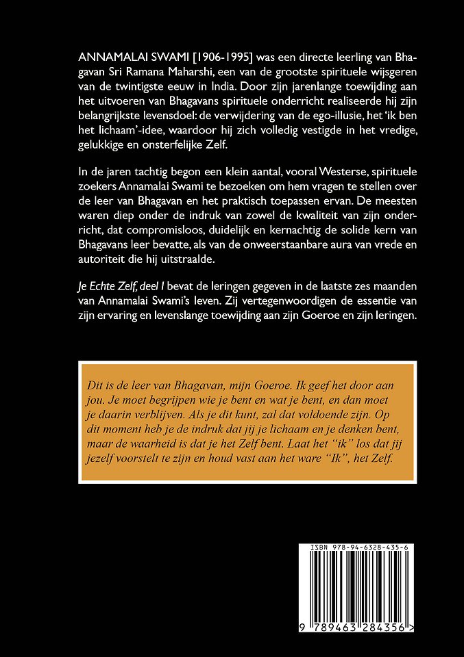Je Echte Zelf, deel I bevat de leringen gegeven in de laatste zes maanden van Annamalai Swami’s leven. Zij vertegenwoordigen de essentie van zijn ervaring en levenslange toewijding aan zijn Goeroe en zijn leringen.