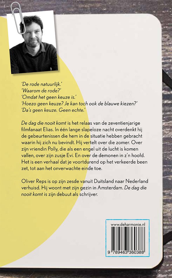 De dag die nooit komt is het relaas van de zeventienjarige filmfanaat Elias. In één lange slapeloze nacht overdenkt hij de gebeurtenissen die hem in de situatie hebben gebracht waarin hij zich nu bevindt. Hij vertelt over die zomer, nu zo'n driekwart jaar geleden. Over zijn vriendin Polly, die als een engel uit de lucht is komen vallen, over zijn zusje Evi. En over de demonen in z'n hoofd. Het is een verhaal waardoor je voortdurend op het verkeerde been wordt gezet, het verrast, ontroert, en het voert je mee tot aan het ontluisterende einde. Het begint zo:
