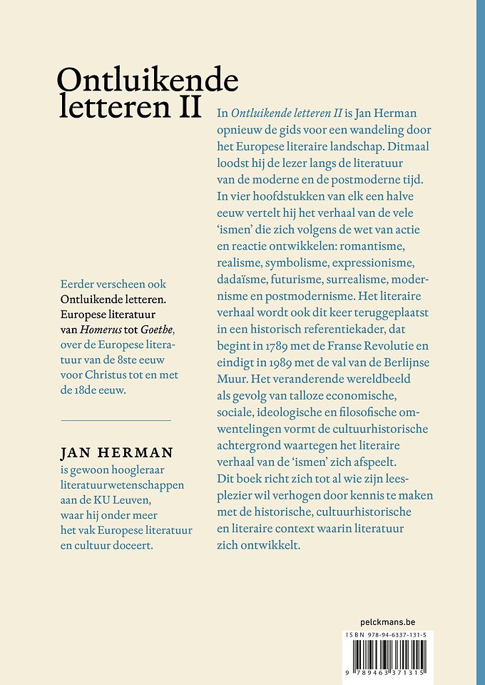 In Ontluikende Letteren II is Jan Herman opnieuw de gids voor een wandeling doorheen het Europese literaire landschap. Ditmaal loodst hij de lezer doorheen de literatuur van de moderne en de postmoderne tijd. In vier hoofdstukken van elk een halve eeuw vertelt hij het verhaal van de vele ‘ismen’ die zich volgens de wet van actie en reactie ontwikkelen: romantisme, realisme, symbolisme, expressionisme, dadaïsme, futurisme, surrealisme, modernisme en postmodernisme. Het literaire verhaal wordt ook dit keer teruggeplaatst in een historisch referentiekader, dat begint in 1789 met de Franse Revolutie en eindigt in 1989 met de val van de Berlijnse muur. Het veranderende wereldbeeld als gevolg van talloze economische, sociale, ideologische en filosofische omwentelingen vormt het cultuurhistorische referentiekader waarin het literaire verhaal van de ‘ismen’ zich afspeelt.