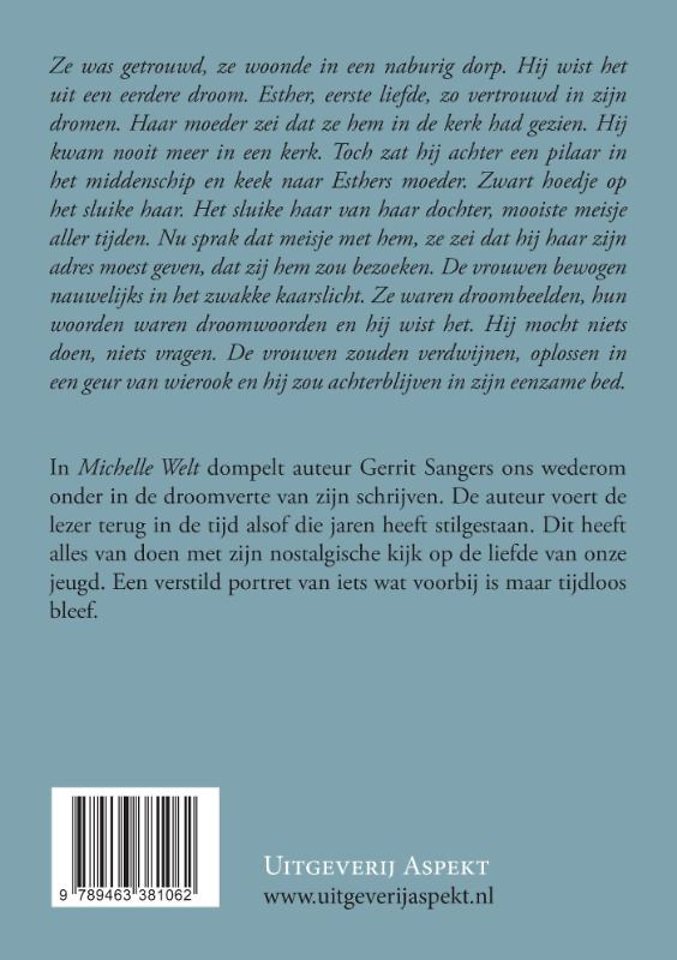 In Michelle Welt dompelt auteur Gerrit Sangers ons wederom onder in de droomverte van zijn schrijven. De auteur voert de lezer terug in de tijd alsof die jaren heeft stilgestaan. Dit heeft alles van doen met zijn nostalgische kijk op de liefde van onze jeugd. Een verstild portret van iets wat voorbij is maar tijdloos bleef.