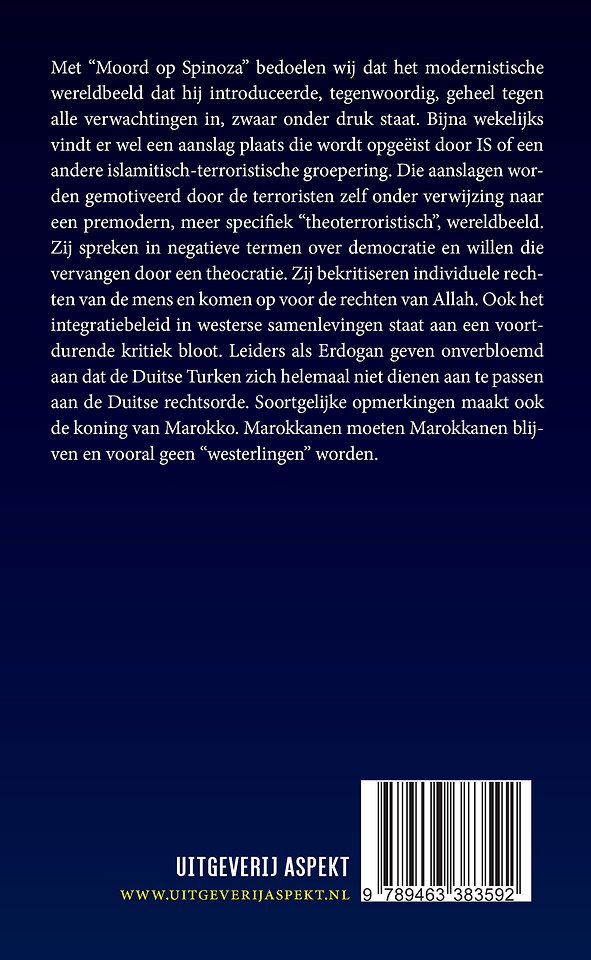 Met Moord op Spinoza bedoelen wij dat het modernistische wereldbeeld dat hij introduceerde, tegenwoordig, geheel tegen alle verwachtingen in, zwaar onder druk staat. Bijna wekelijks vindt er wel een aanslag plaats die wordt opgeëist door IS of een andere islamitisch-terroristische groepering. Die aanslagen worden gemotiveerd door de terroristen zelf onder verwijzing naar een premodern, meer specifiek theoterroristisch, wereldbeeld. Zij spreken in negatieve termen over democratie en willen die vervangen door een theocratie. Zij bekritiseren individuele rechten van de mens en komen op voor de rechten van Allah. Ook het integratiebeleid in westerse samenlevingen staat aan een voortdurende kritiek bloot. Leiders als Erdogan geven onverbloemd aan dat de Duitse Turken zich helemaal niet dienen aan te passen aan de Duitse rechtsorde. Soortgelijke opmerkingen maakt ook de koning van Marokko. Marokkanen moeten Marokkanen blijven en vooral geen westerlingen worden.