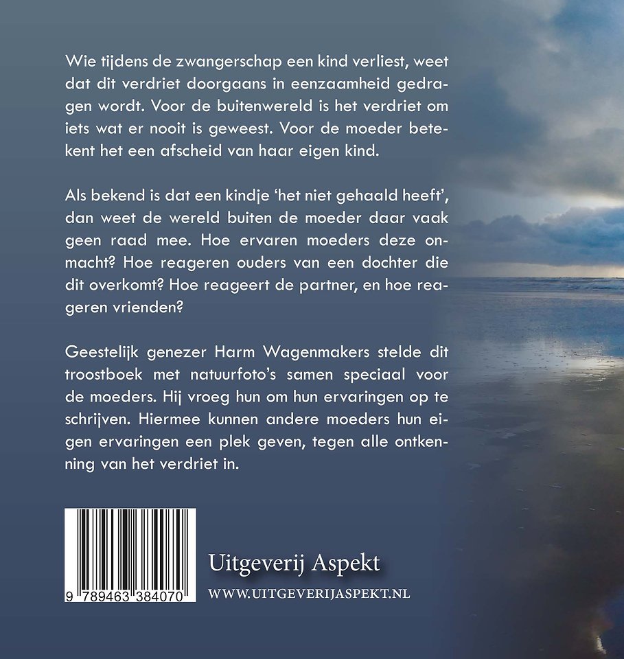 Geestelijk genezer Harm Wagenmakers stelde dit troostboek met natuurfoto’s samen speciaal voor de moeders. Hij vroeg hun om hun ervaringen op te schrijven. Hiermee kunnen andere moeders hun eigen ervaringen een plek geven, tegen alle ontkenning van het verdriet in.