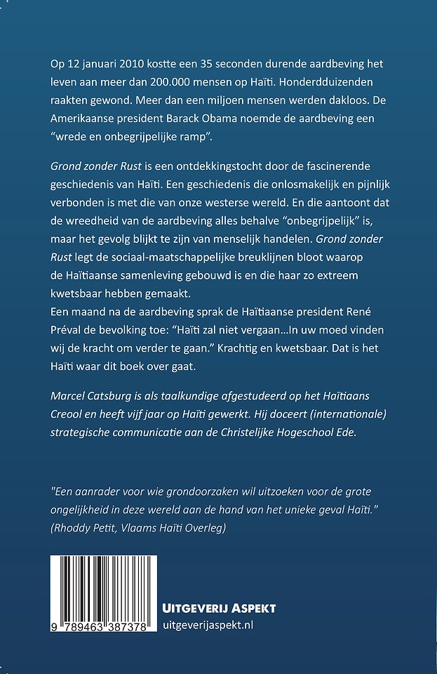 Grond zonder Rust is een ontdekkingstocht door de fascinerende geschiedenis van Haïti. Een geschiedenis die onlosmakelijk en pijnlijk verbonden is met die van onze westerse wereld. En die aantoont dat de wreedheid van de aardbeving alles behalve “onbegrijpelijk” is, maar het gevolg blijkt te zijn van menselijk handelen. Grond zonder Rust legt de sociaal-maatschappelijke breuklijnen bloot waarop de Haïtiaanse samenleving gebouwd is en die haar zo extreem kwetsbaar hebben gemaakt. Een maand na de aardbeving sprak de Haïtiaanse president René Préval de bevolking toe: “Haïti zal niet vergaan…In uw moed vinden wij de kracht om verder te gaan.” Krachtig en kwetsbaar. Dat is het Haïti waar dit boek over gaat.