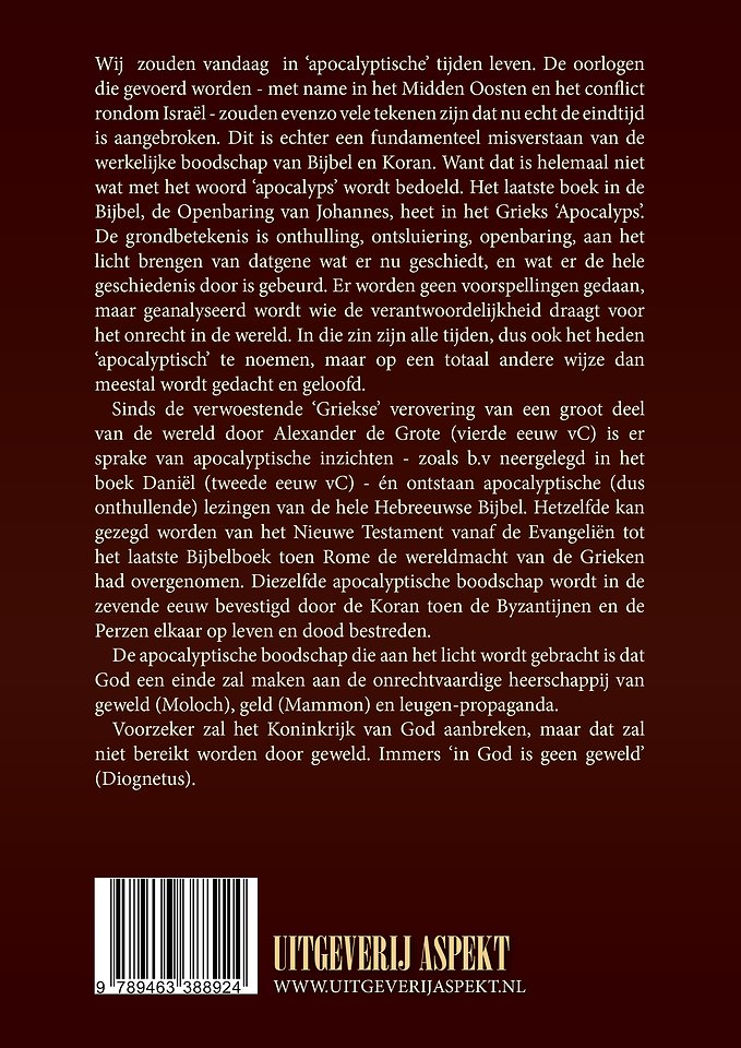 Wij zouden vandaag in ‘apocalyptische’ tijden leven. De oorlogen die gevoerd worden - met name in het Midden Oosten en het conflict rondom Israël - zouden evenzo vele tekenen zijn dat nu echt de eindtijd is aangebroken. Dit is echter een fundamenteel misverstaan van de werkelijke boodschap van Bijbel en Koran. Want dat is helemaal niet wat met het woord ‘apocalyps’ wordt bedoeld. Het laatste boek in de Bijbel, de Openbaring van Johannes, heet in het Grieks ‘Apocalyps’. De grondbetekenis is onthulling, ontsluiering, openbaring, aan het licht brengen van datgene wat er nu geschiedt, en wat er de hele geschiedenis door is gebeurd. Er worden geen voorspellingen gedaan, maar geanalyseerd wordt wie de verantwoordelijkheid draagt voor het onrecht in de wereld. In die zin zijn alle tijden, dus ook het heden ‘apocalyptisch’ te noemen, maar op een totaal andere wijze dan meestal wordt gedacht en geloofd.