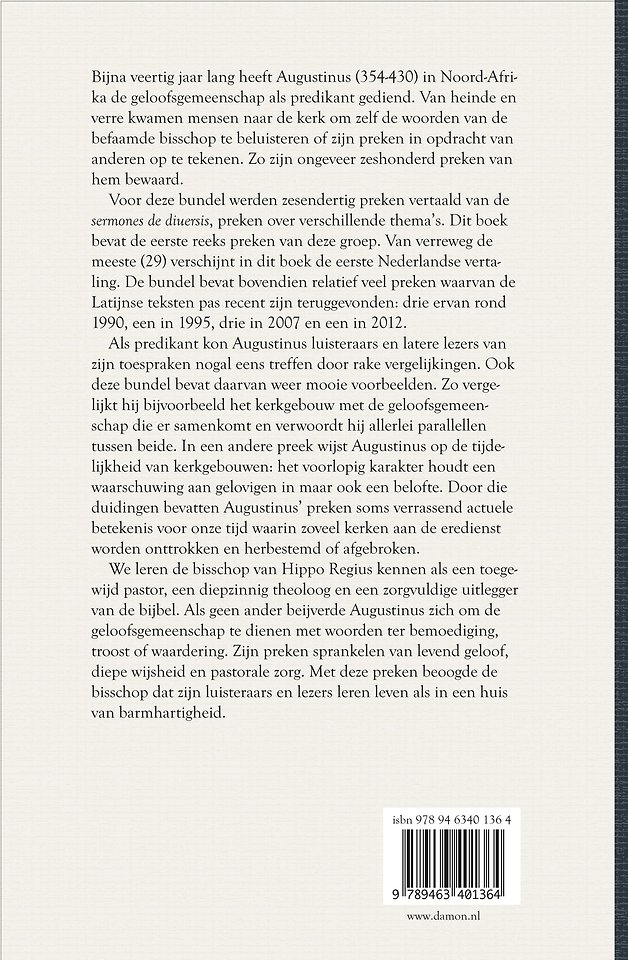 We leren de bisschop van Hippo Regius kennen als een toegewijd pastor, een diepzinnig theoloog en een zorgvuldige uitlegger van de bijbel. Als geen ander beijverde Augustinus zich om de geloofsgemeenschap te dienen met woorden ter bemoediging, troost of waardering. Zijn preken sprankelen van levend geloof, diepe wijsheid en pastorale zorg. Met deze preken beoogde de bisschop dat zijn luisteraars en lezers leren leven als in een huis van barmhartigheid.