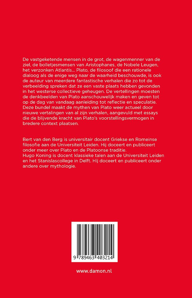De vastgeketende mensen in de grot, de wagenmenner van de ziel, de bolletjesmensen van Aristophanes, de Nobele Leugen, het verzonken Atlantis… Plato, de filosoof die een rationele dialoog als de enige weg naar de waarheid beschouwde, is ook de auteur van meerdere fantastische verhalen die zo tot de verbeelding spreken dat ze een vaste plaats hebben gevonden in het westerse collectieve geheugen. De vertellingen moesten de denkbeelden van Plato aanschouwelijk maken en geven tot op de dag van vandaag aanleiding tot reflectie en speculatie.