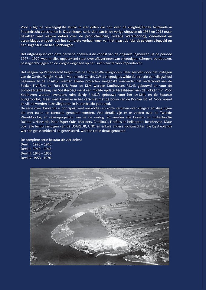 Voor u ligt de omvangrijkste studie in drie delen die ooit over de vliegtuigfabriek Aviolanda in Papendrecht verschenen is. Deze nieuwe serie sluit aan bij de vorige uitgaven uit 1987 en 2013 maar bevatten veel nieuwe details over de productielijnen, Tweede Wereldoorlog, onderhoud en assemblages en geeft ook het complete verhaal weer van het naast de fabriek gelegen vliegveld op het Hoge Stuk van het Slobbengors.