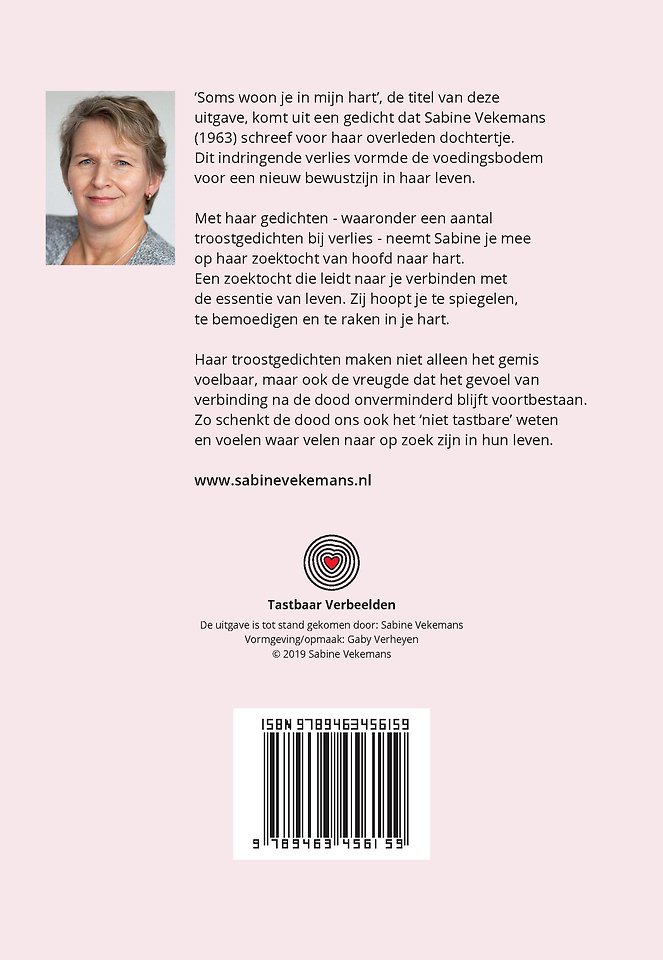 ‘Soms woon je in mijn hart’, de titel van deze uitgave, komt uit een gedicht dat Sabine Vekemans (1963) schreef voor haar overleden dochtertje. Dit indringende verlies vormde de voedingsbodem voor een nieuw bewustzijn in haar leven.