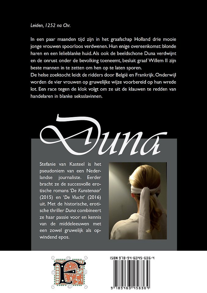 Stefanie van Kasteel is het pseudoniem van een Nederlandse journaliste. Eerder bracht ze de succesvolle erotische romans ‘De Kunstenaar’ (2015) en ‘De Vlucht’ (2016) uit. Met de historische, erotische thriller Duna combineert ze haar passie voor en kennis van de middeleeuwen met een zowel gruwelijk als opwindend epos.