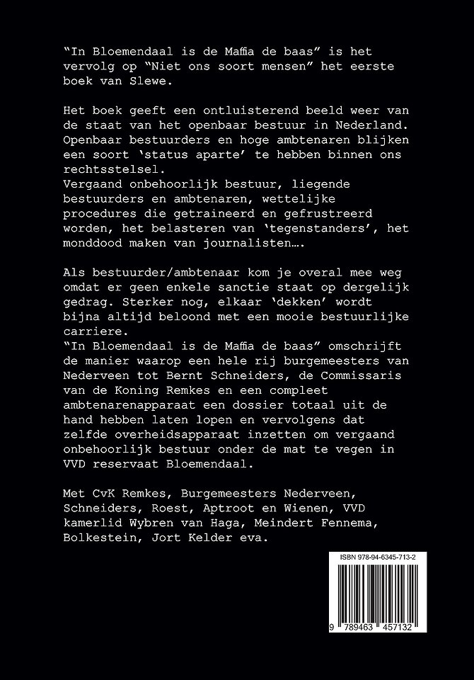“In Bloemendaal is de Maffia de baas” omschrijft de manier waarop een hele rij burgemeesters van Nederveen tot Bernt Schneiders, de Commissaris van de Koning Remkes en een compleet ambtenarenapparaat een dossier totaal uit de hand hebben laten lopen en vervolgens dat zelfde overheidsapparaat inzetten om vergaand onbehoorlijk bestuur onder de mat te vegen in VVD reservaat Bloemendaal.