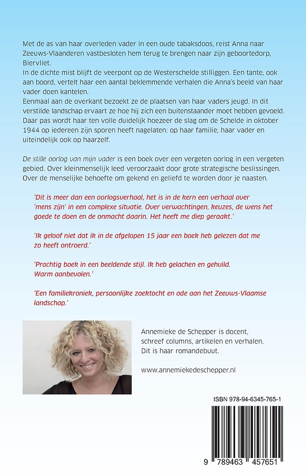 Eenmaal aan de overkant bezoekt ze de plaatsen van haar vaders jeugd. In dit verstilde landschap ervaart ze hoe hij zich een buitenstaander moet hebben gevoeld. Daar pas wordt haar ten volle duidelijk hoezeer de slag om de Schelde in oktober 1944 op iedereen zijn sporen heeft nagelaten: op haar familie, haar vader en uiteindelijk ook op haarzelf.