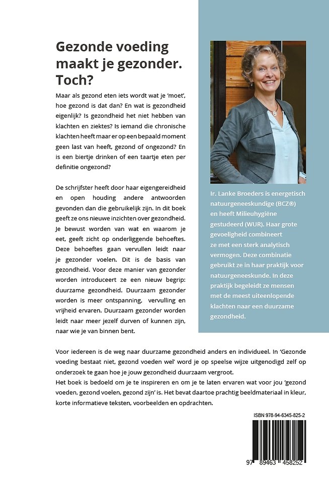 De schrijfster heeft door haar eigengereidheid en open houding andere antwoorden gevonden dan die gebruikelijk zijn. In dit boek geeft ze ons nieuwe inzichten over gezondheid. Je bewust worden van wat en waarom je eet, geeft zicht op onderliggende behoeftes. Deze behoeftes gaan vervullen leidt naar je gezonder voelen. Dit is de basis van gezondheid. Voor deze manier van gezonder worden introduceert ze een nieuw begrip: duurzame gezondheid. Duurzaam gezonder worden is meer ontspanning, vervulling en vrijheid ervaren. Duurzaam gezonder worden leidt naar meer jezelf durven of kunnen zijn, naar wie je van binnen bent.