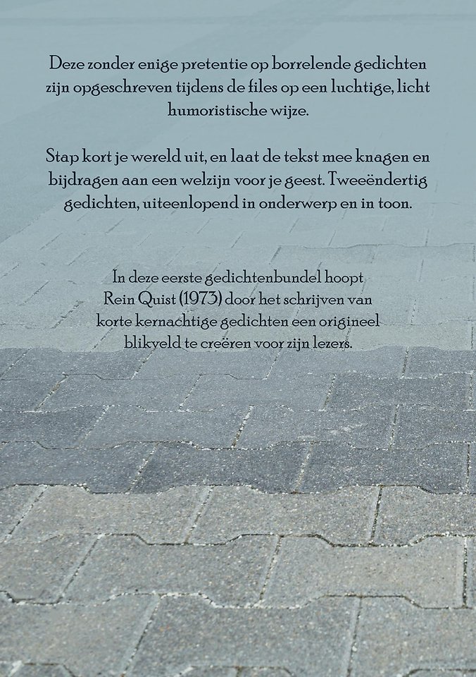 Deze zonder enige pretentie op borrelende gedichten zijn opgeschreven tijdens de files op een luchtige, licht humoristische wijze. Stap kort je wereld uit, en laat de tekst mee knagen en bijdragen aan een welzijn voor je geest. Tweeëndertig gedichten, uiteenlopend in onderwerp en in toon.
