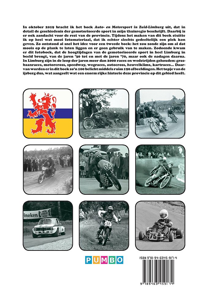 In oktober 2019 bracht ik het boek Auto- en Motorsport in Zuid-Limburg uit, dat in detail de geschiedenis der gemotoriseerde sport in mijn thuisregio beschrijft. Daarbij is er ook aandacht voor de rest van de provincie. Tijdens het maken van dit boek stuitte ik op heel wat mooi fotomateriaal, dat ik echter slechts gedeeltelijk een plek kon geven. Zo ontstond al snel het idee voor een tweede boek: het zou zonde zijn om al dat moois op de plank te laten liggen en er geen gebruik van te maken. Zodoende kwam er dit fotoboek, dat de hoogtijdagen van de gemotoriseerde sport in heel Limburg in beeld brengt, van de jaren '30 tot en met de jaren '70, maar ook de nadagen daarna. In Limburg zijn in de loop der jaren meer dan 2000 races en wedstrijden gehouden: grasbaanraces, motorcross, speedway, wegraces, autocross, heuvelklims, kartraces... Daarvan worden er in dit boek zo'n 100 belicht middels ruim 190 afbeeldingen. Het topje van de ijsberg dus, wat aangeeft wat een enorm rijke historie deze provincie op dit gebied heeft.