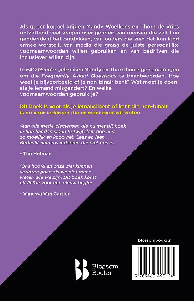 Als queer stel krijgen Mandy Woelkens en Thorn de Vries ontzettend veel vragen over gender: van ouders die zien dat hun kind ermee worstelt, van media die graag de juiste persoonlijke voornaamwoorden willen gebruiken maar twijfelen hoe het hoort, van bedrijven die inclusiever willen zijn, van mensen die een naaste hebben die non-binair of zoekende is en van mensen die zelf hun genderidentiteit ontdekken.