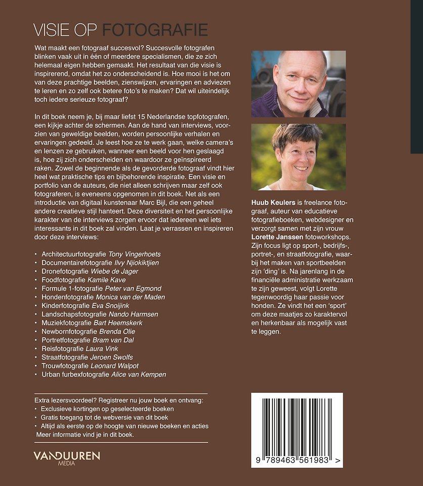 In dit boek neem je, bij maar liefst 15 Nederlandse topfotografen, een kijkje achter de schermen. Aan de hand van interviews, voorzien van geweldige beelden, worden persoonlijke verhalen en ervaringen gedeeld. Je leest hoe ze te werk gaan, welke camera’s en lenzen ze gebruiken, wanneer een beeld voor hen geslaagd is, hoe zij zich onderscheiden en waardoor ze geïnspireerd raken. Zowel de beginnende als de gevorderde fotograaf vindt hier heel wat praktische tips en bijbehorende inspiratie. Een visie en portfolio van de auteurs, die niet alleen schrijven maar zelf ook fotograferen, is eveneens opgenomen in dit boek. Net als een introductie van digitaal kunstenaar Marc Bijl, die een geheel andere creatieve stijl hanteert. Deze diversiteit en het persoonlijke karakter van de interviews, zorgen ervoor dat iedereen wel iets interessants in dit boek zal vinden.