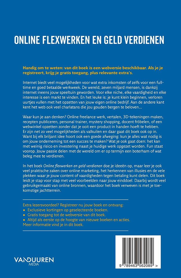 In het boek 'Online flexwerken en geld verdienen' doe je ideeën op, maar leer je ook veel praktische zaken over online marketing, het herkennen van illusies en de vele plekken waar je jouw content of skills tegen betaling kunt delen. Dit boek leidt je stap-voor-stap met veel voorbeelden naar jouw einddoel. Daarbij wordt veel gebruikgemaakt van online bronnen, waardoor het boek verweven is met je toekomstige jachtterrein.