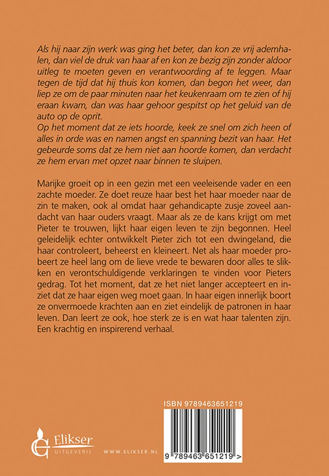 Marijke groeit op in een gezin met een veeleisende vader en een zachte moeder. Ze doet reuze haar best het haar moeder naar de zin te maken, ook al omdat haar gehandicapte zusje zoveel aandacht van haar ouders vraagt. Maar als ze de kans krijgt om met Pieter te trouwen, lijkt haar eigen leven te zijn begonnen. Heel geleidelijk echter ontwikkelt Pieter zich tot een dwingeland, die haar controleert, beheerst en kleineert. Net als haar moeder probeert ze heel lang om de lieve vrede te bewaren door alles te slikken en verontschuldigende verklaringen te vinden voor Pieters gedrag. Tot het moment, dat ze het niet langer accepteert en inziet dat ze haar eigen weg moet gaan. In haar eigen innerlijk boort ze onvermoede krachten aan en ziet eindelijk de patronen in haar leven. Dan leert ze ook, hoe sterk ze is en wat haar talenten zijn. Een krachtig en inspirerend verhaal.