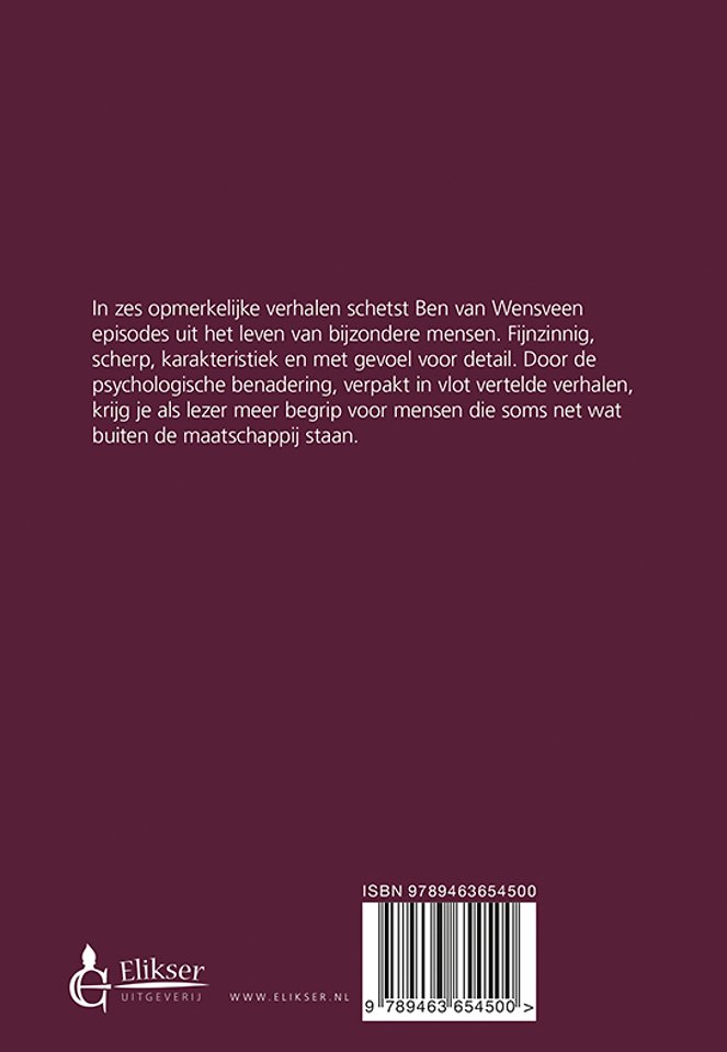 In zes opmerkelijke verhalen schetst Ben van Wensveen episodes uit het leven van bijzondere mensen. Fijnzinnig, scherp, karakteristiek en met gevoel voor detail. Door de psychologische benadering, verpakt in vlot vertelde verhalen, krijg je als lezer meer begrip voor mensen die soms net wat buiten de maatschappij staan.