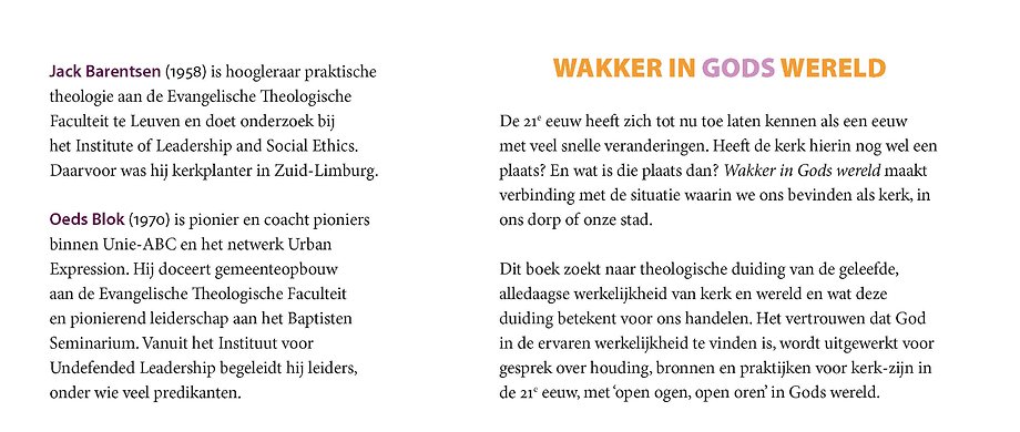 De 21e eeuw heeft zich tot nu toe laten kennen als een eeuw met veel, snelle veranderingen. Heeft de kerk hierin nog wel een plaats? En wat is die plaats dan? Wakker in Gods wereld maakt verbinding met de situatie waarin we ons bevinden als kerk, in ons dorp of onze stad. Dit boek zoekt naar theologische duiding van de geleefde, alledaagse werkelijkheid van kerk en wereld en wat deze duiding betekent voor ons handelen. Het vertrouwen dat God in de ervaren werkelijkheid te vinden is, wordt uitgewerkt voor gesprek over houding, bronnen en praktijken voor kerkzijn in de 21e eeuw, met ‘open ogen, open oren’ in Gods wereld.