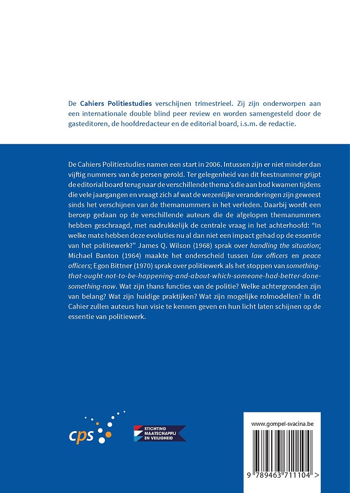 De Cahiers Politiestudies namen een start in 2006. Intussen zijn er niet minder dan vijftig nummers van de persen gerold. Ter gelegenheid van dit feestnummer grijpt de editorial board terug naar de verschillende thema’s die aan bod kwamen tijdens die vele jaargangen en vraagt zich af wat de wezenlijke veranderingen zijn geweest sinds het verschijnen van de themanummers in het verleden. Daarbij wordt een beroep gedaan op de verschillende auteurs die de afgelopen themanummers hebben geschraagd, met nadrukkelijk de centrale vraag in het achterhoofd: “In welke mate hebben deze evoluties nu al dan niet een impact gehad op de essentie van het politiewerk?” James Q. Wilson (1968) sprak over handling the situation; Michael Banton (1964) maakte het onderscheid tussen law officers en peace officers; Egon Bittner (1970) sprak over politiewerk als het stoppen van something-that-ought-not-to-be-happening-and-about-which-someone-had-better-done-something-now. Wat zijn thans functies van de politie? Welke achtergronden zijn van belang? Wat zijn huidige praktijken? Wat zijn mogelijke rolmodellen? In dit Cahier zullen auteurs hun visie te kennen geven en hun licht laten schijnen op de essentie van politiewerk.