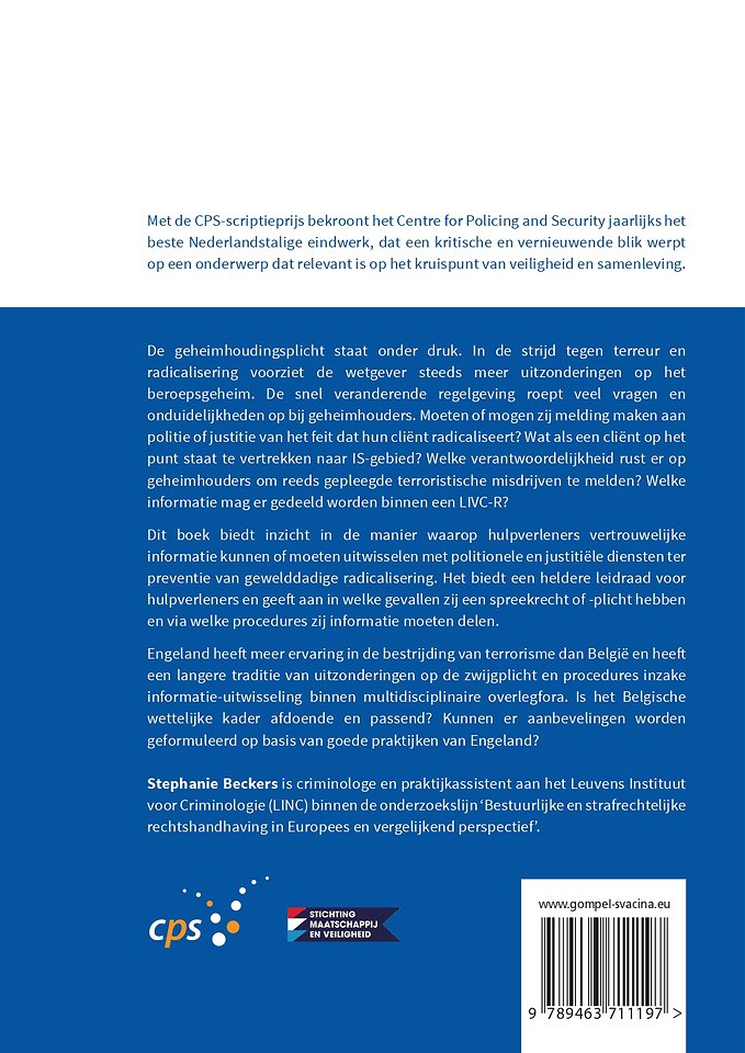 Dit boek biedt inzicht in de manier waarop hulpverleners vertrouwelijke informatie kunnen of moeten uitwisselen met politionele en justitiële diensten ter preventie van gewelddadige radicalisering. Het biedt een heldere leidraad voor hulpverleners en geeft aan in welke gevallen zij een spreekrecht of -plicht hebben en via welke procedures zij informatie moeten delen.
