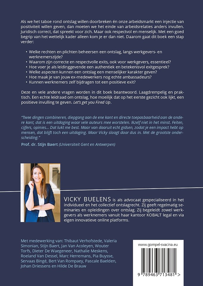 Deze en vele andere vragen worden in dit boek beantwoord. Laagdrempelig en praktisch. Een echte leidraad om ontslag, hoe moeilijk dat op het eerste gezicht ook lijkt, een positieve invulling te geven. Let’s get you Fired Up.