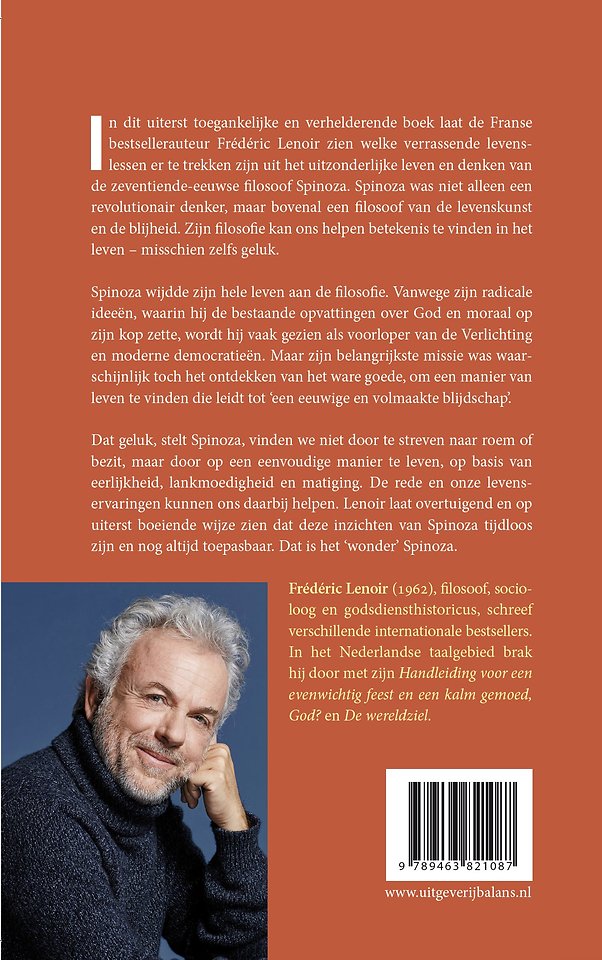 Dat geluk, stelt Spinoza, vinden we niet door te streven naar roem of bezit, maar door op een eenvoudige manier te leven, op basis van eerlijkheid, lankmoedigheid en matiging. De rede en onze levenservaringen kunnen ons daarbij helpen. Lenoir laat overtuigend en op uiterst boeiende wijze zien dat deze inzichten van Spinoza tijdloos zijn en nog altijd toepasbaar. Dat is het ‘wonder’ Spinoza.