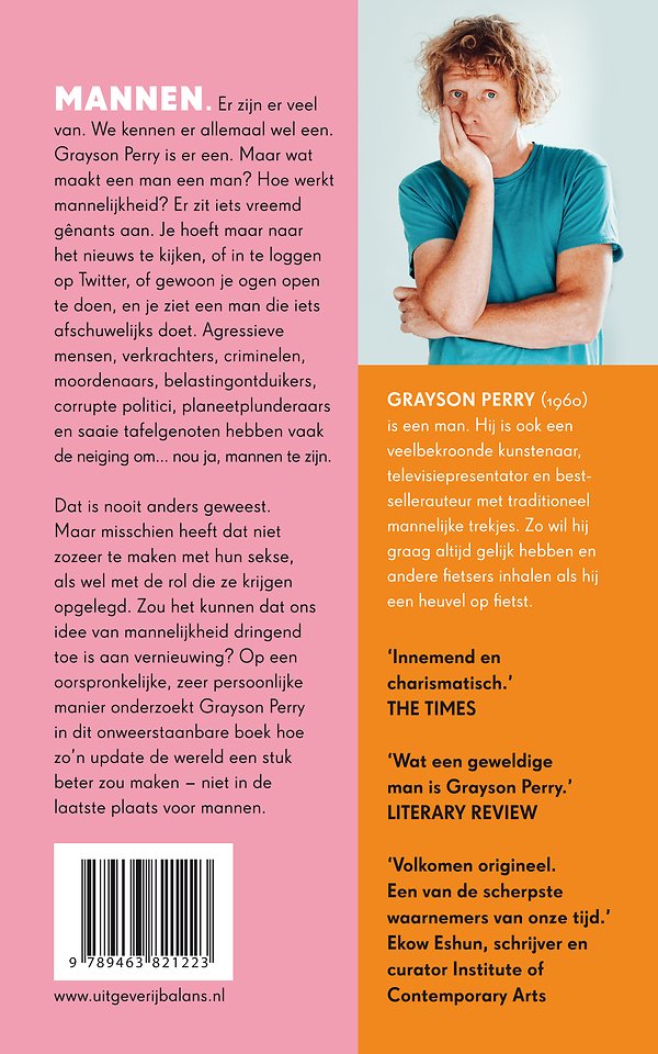 Mannen. Er zijn er veel van. We kennen er allemaal wel een. Grayson Perry is er een. Maar wat maakt een man een man? Hoe werkt mannelijkheid? Er zit iets vreemd gênants aan. Je hoeft maar naar het nieuws te kijken, of in te loggen op Twitter, of gewoon je ogen open te doen, en je ziet een man die iets afschuwelijks doet. Agressieve mensen, verkrachters, criminelen, moordenaars, belastingontduikers, corrupte politici, planeetplunderaars en saaie tafelgenoten hebben vaak de neiging om… nou ja, mannen te zijn.
