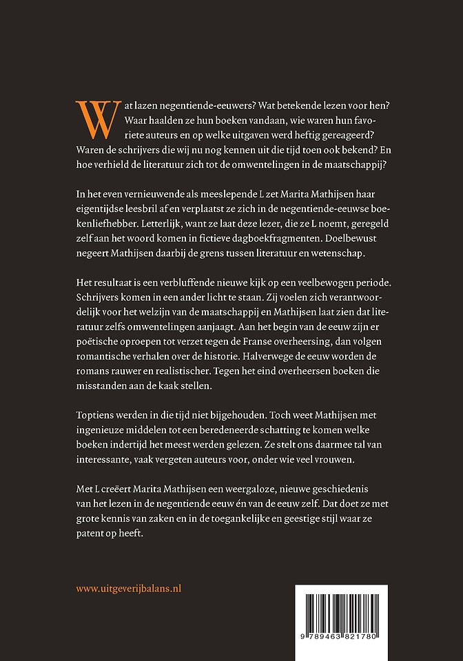 In het even vernieuwende als meeslepende L zet Marita Mathijsen haar eigentijdse leesbril af en verplaatst ze zich in de negentiende-eeuwse boekenliefhebber. Letterlijk, want ze laat deze lezer, die ze L noemt, geregeld zelf aan het woord komen in fictieve dagboekfragmenten. Doelbewust negeert Mathijsen daarbij de grens tussen literatuur en wetenschap.