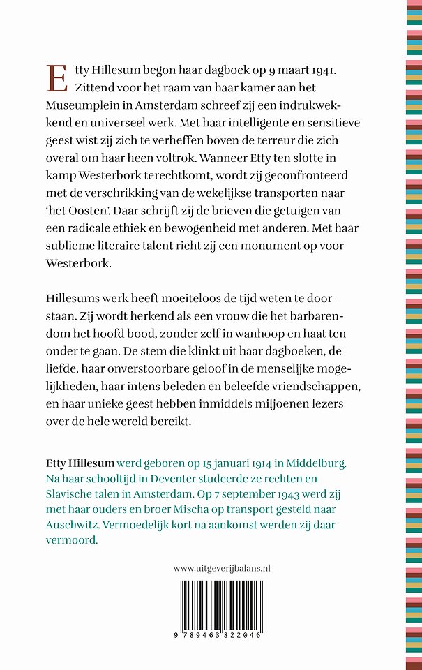 Etty Hillesum begon haar dagboek op 9 maart 1941. Zittend voor het raam van haar kamer aan het Museumplein in Amsterdam schreef zij een indrukwekkend en universeel werk. Met haar intelligente en sensitieve geest wist zij zich te verheffen boven de terreur die zich overal om haar heen voltrok. Wanneer Etty ten slotte in kamp Westerbork terechtkomt, wordt zij geconfronteerd met de verschrikking van de wekelijkse transporten naar ‘het Oosten’. Daar schrijft zij de brieven die getuigen van een radicale ethiek en bewogenheid met anderen. Met haar sublieme literaire talent richt zij een monument op voor Westerbork.